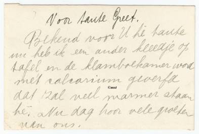 “Voor tante Greet, Bekend voor U hè tante? Nu heb ik een ander kleedje op tafel en de klamboekamer wordt met calcanium geverfd. Dat zal veel warmer staan hè? Nu dag hoor, vele groeten van ons” (Met Van den Berg)