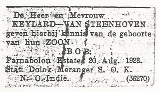 Wim en Cor geboren, de jongen werd Bob genoemd.
